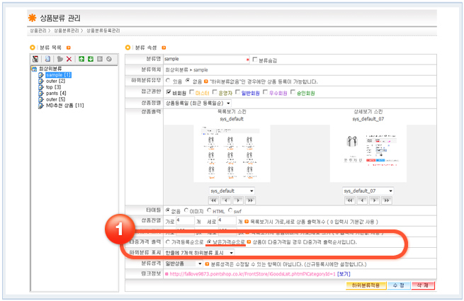1) °ü¸®ÀÚ > »óǰ°ü¸® > »óǰºÐ·ù°ü¸®¿¡¼ ¾Æ·¡¿Í °°ÀÌ ºÐ·ù¼Ó¼º¿¡ ÇÏ´ÜÀ» º¸½Ã¸é ´ÙÁß°¡°Ý Ãâ·ÂºÎºÐ¿¡