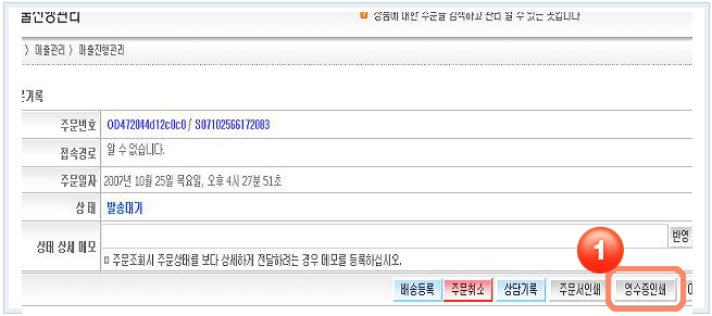 1)°ü¸®ÀÚ>¸ÅÃâ°ü¸®>¸ÅÃâÁøÇà°ü¸®¿¡¼ ÁÖ¹®ÀÏÀÚ¸¦ Ŭ¸¯ÇÏ½Ã¸é ¿µ¼öÁõÀμ⸦ Ŭ¸¯ÇØÁÖ¼¼¿ä.