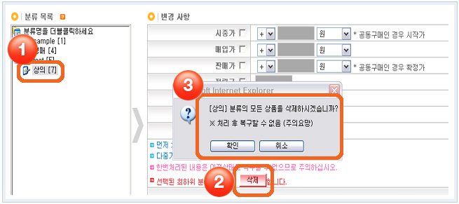 1)°ü¸®ÀÚ>»óǰ°ü¸®>»óǰÁ¤º¸ Àϰý°ü¸®¿¡¼ »óǰ»èÁ¦¸¦ ¿øÇϽô ºÐ·ù¸íÀ» ´õºíŬ¸¯Çϼ¼¿ä.