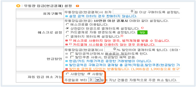 1) °ü¸®ÀÚ>»óÁ¡°ü¸®>¿î¿µÁ¤º¸ ¼³Á¤>°áÁ¦¼ö´Ü ¼³Á¤¿¡¼ ¹«ÅëÀå ÀÔ±Ý(Çö±Ý°áÁ¦) ¼³Á¤ºÎºÐ¿¡ ÀÚµ¿ ÀÔ±Ý Ãë¼Ò ±â´ÉÀ» ¼³Á¤ÇÏ½Ç ¼ö ÀÖ½À´Ï´Ù.