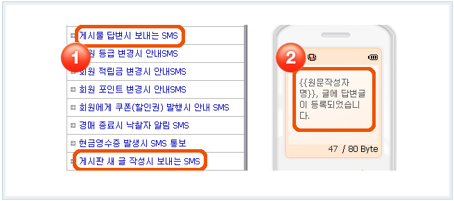 1) °ü¸®ÀÚ>¸¶ÄÉÆÃÁö¿ø>SMS¹ß¼Û>SMS ȯ°æ¼³Á¤¿¡¼ °Ô½Ã¹° ´äº¯½Ã º¸³»´Â SMS/°Ô½ÃÆÇ »õ ±Û ÀÛ¼º½Ã º¸³»´Â SMS¸¦ Ŭ¸¯ÇÏ½Ã¾î ¿øÇϽô ¹®ÀåÀ¸·Î º¯°æÇϽŠÈÄ ÀÌ¿ëÇÏ½Ç »ç¿ëÀÚ/°ü¸®ÀÚ ºÎºÐÀ» üũÇÏ¿© Àû¿ëÇϼ¼¿ä.