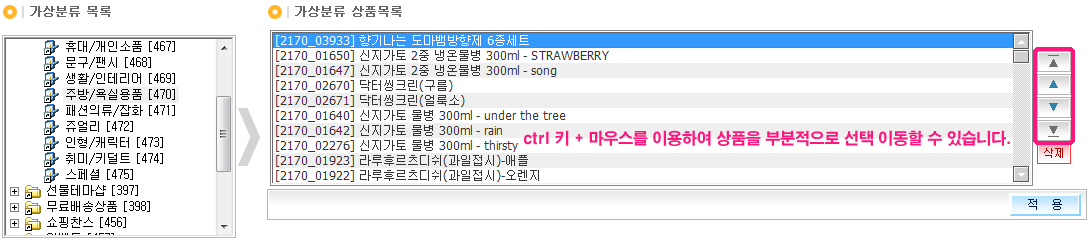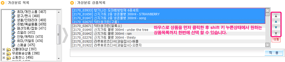 2. °¡»óºÐ·ù »óǰ¸ñ·Ï¿¡ ³ªÅ¸³ »óǰ¸ñ·ÏµéÀ» ¾Æ·¡ ±×¸²Ã³·³ shiftŰ³ª ctrl۸¦ ÀÌ¿ëÇÏ¿© ¼±ÅÃÇÑ ÈÄ ¿ìÃø¿¡ ÀÖ´Â ¹æÇâ۸¦ ´·¯ ¿øÇÏ´Â À§Ä¡·Î À̵¿½ÃŲ ÈÄ [Àû¿ë] ¹öưÀ» ´·¯ÁÝ´Ï´Ù.