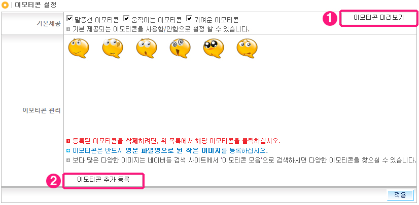 À̸ðƼÄÜ °ü¸®ºÎºÐ¿¡ ÀÖ´Â [À̸ðƼÄÜ Ãß°¡ µî·Ï] ¹öưÀ» Ŭ¸¯ÇÑ ÈÄ À̸ðƼÄÜ µî·Ï±â âÀÌ ¶ß¸é "ÆÄÀϼ±ÅÃ" ¹öưÀ» ´·¯ ¿øÇÏ´Â À̹ÌÁö¸¦ ºÒ·¯¿Â µÚ