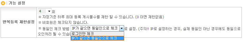 2. ±â´É¼³Á¤ ºÎºÐÀÇ ¹Ýº¹µî·Ï Á¦ÇѼ³Á¤ Ƚ¼ö¸¦ ÁöÁ¤ÇϽŠÈÄ "IP°¡ °°À¸¸é µ¿ÀÏÀΠüũ" ºÎºÐÀ» ¼±ÅÃÇÕ´Ï´Ù. (´Ü 0ȸ ·Î ÁöÁ¤ÇϽаæ¿ì´Â Á¦ÇѵÇÁö¾Ê½À´Ï´Ù. ¶ÇÇÑ ºñȸ¿øÀº ÇØ´çµÇÁö¾Ê½À´Ï´Ù.)