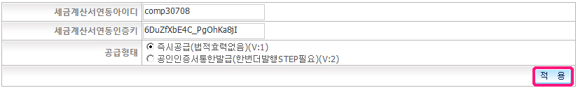 2. ¼³Á¤°ü¸® ¸Þ´º·Î À̵¿ÇϽøé ÀüÀÚ¼¼±Ý°è»ê¼ °¡ÀÔ½ÅûÀÌ ¿Ï·áµÈ °æ¿ì ¾Æ·¡ ±×¸²°ú °°ÀÌ ¼¼±Ý°è»ê¼¿¬µ¿¾ÆÀ̵ð,¿¬µ¿ÀÎÁõŰÁ¤º¸°¡ ÀÚµ¿À¸·Î ¼³Á¤µË´Ï´Ù.