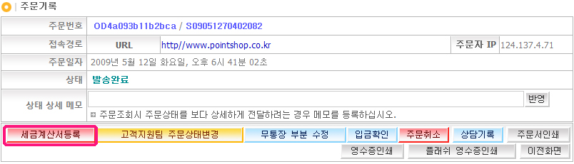 ¼¼±Ý°è»ê¼ ¹ßÇàÇϱâ -> °ü¸®ÀÚ ¡·¸ÅÃâ°ü¸® ¡· ¸ÅÃâ°ü¸® ¡· ¸ÅÃâÁøÇà°ü¸® ÆäÀÌÁö¿¡ ÁÖ¹®¼ »ó¼¼º¸±â »ó´Ü¿¡ ¾Æ·¡ ±×¸²°ú °°ÀÌ [¼¼±Ý°è»ê¼µî·Ï] ¹öưÀ» Ŭ¸¯ÇÕ´Ï´Ù.