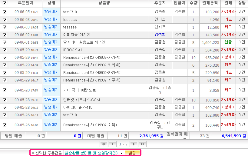 ¾Æ·¡ ±×¸²°ú °°ÀÌ ¹ß¼Û´ë±â »óÅÂÀÇ ÁÖ¹®°ÇÀÌ ¿©·¯°³ Ãâ·ÂµÇ¸é ¼±ÅÃÇÑ ÁÖ¹®°ÇÀ» "¹ß¼Û¿Ï·á »óÅ·Î(¹è¼ÛÀϰýó¸®)" [º¯°æ] À» Ŭ¸¯ÇÕ´Ï´Ù.
