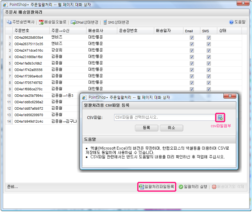 2. ÁÖ¹®¹øÈ£¿Í ¹è¼Û¹øÈ£°¡ ÀúÀåµÈ csv ÆÄÀÏÀ» [Àϰý󸮹è¼Ûµî·Ï] ¹öưÀ» Ŭ¸¯ÇÏ¿© ÷ºÎÇÑ ÈÄ [µî·Ï] ¹öưÀ» Ŭ¸¯ÇÕ´Ï´Ù.