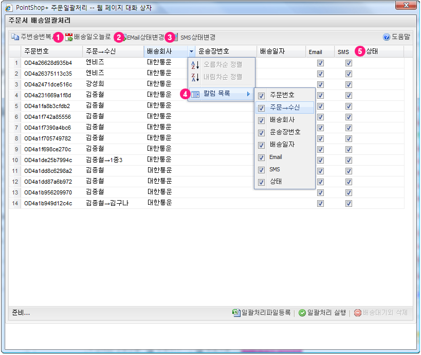 3. SMS»óꝰæ : ¹è¼Ûµî·ÏÀÌ ÁøÇàµÉ¶§ ¹è¼Û¾È³»¸¦ SMS¹®ÀÚ¸Þ¼¼Áö¿Í ÇÔ²² ¹ß¼ÛÇÒ¶§ ¹ß¼Û¿©ºÎ¸¦ Àϰý¼±ÅÃ,ÇØÁ¦ °¡´ÉÇÕ´Ï´Ù.