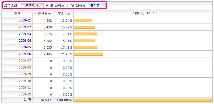 ¾Æ·¡ ±×·¥°ú °°ÀÌ È¸¿ø°¡ÀÔ¼ö¸¦ ¿ù´ÜÀ§·Î º¸°íÀÚÇÏ½Ã¸é °Ë»öÁ¶°ÇÀ» "¿ù ´ÜÀ§·Î" ¼±ÅÃÇÏ¿© Åë°èº¸±â¸¦ ÇϽøéµÇ°í "ÀÏ ´ÜÀ§·Î" ¼±Åýÿ¡´Â °Ë»öÁ¶°ÇºÎºÐ ³¯Â¥¹öư¿¡ ÇØ´ç ¿ùÀ» ¼±ÅÃÇØÁֽŠÈÄ