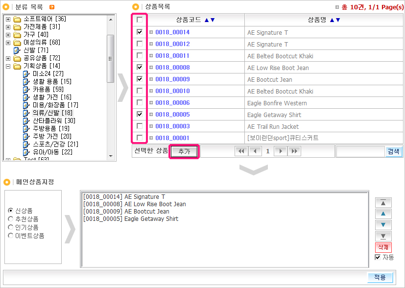 »óǰÀ» Ãß°¡ÇÒ ºÐ·ù¸¦ ¸ÕÀú ÁÂÃø ºÐ·ù¸ñ·Ï¿¡¼ ¼±Åà ÈÄ ¿ìÃø¿¡ »óǰ¸ñ·Ï¿¡ Ãâ·ÂµÇ¸é ¸ÞÀλóǰÀ¸·Î µî·ÏÇÒ »óǰÀ» ¾Æ·¡ ±×¸²°ú °°ÀÌ Ã¼Å©¹Ú½º·Î