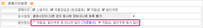 1. °ü¸®ÀÚ ¡· »óÁ¡°ü¸® ¡· ¿î¿µÁ¤º¸¼³Á¤ ¡· °áÁ¦¼ö´Ü¼³Á¤ ºÎºÐ¿¡ ÇÒÀÎÇü½ÄÀ» "Àû¸³±Ý, ÇÒÀÎÄíÆù µ¿½Ã ÇÒÀÎ" À¸·Î ¼±Åà ÈÄ ¿ìÃø ÇÏ´Ü [Àû¿ë] ¹öưÀ» Ŭ¸¯ÇÕ´Ï´Ù.