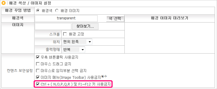 1. °ü¸®ÀÚ ¡· µðÀÚÀΰü¸® ¡· »óÁ¡È¸é±¸¼º ¡· ¹è°æ »ö»ó/À̹ÌÁö ¼³Á¤¿¡ ÄÁÅÙÃ÷ º¸¾È¼³Á¤ ºÎºÐÀÇ "Ctrl + ( N,O,P,Q,R ) ¹× F1~F12 Ű »ç¿ë±ÝÁö" Ç׸ñ¿¡ üũÇÑ ÈÄ [Àû¿ë] À» Ŭ¸¯ÇÕ´Ï´Ù.
