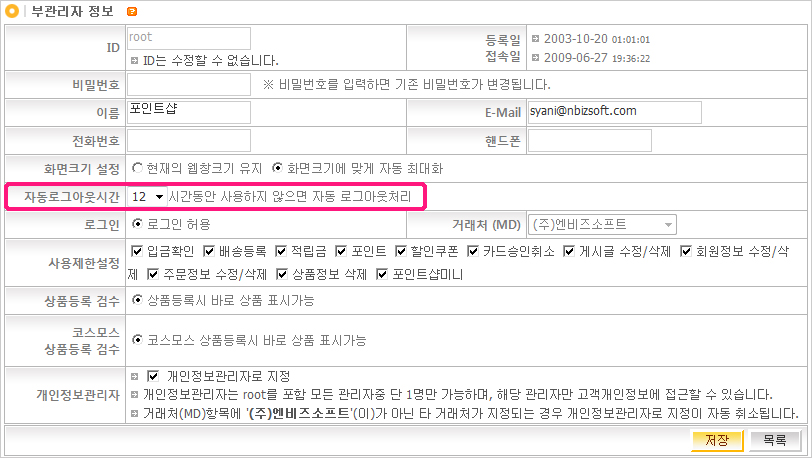 »óÁ¡°ü¸®ÀÚ°¡ ·Î±×ÀÎ ÈÄ Àå½Ã°£ ÀÚ¸®¸¦ ºñ¿î°æ¿ì ÀÏÁ¤ÇÑ ½Ã°£ÀÌ Áö³ª¸é ÀÚµ¿À¸·Î ·Î±×¾Æ¿ôÀÌ µÇ´Â ±â´ÉÀÔ´Ï´Ù. ±âÁ¸¿¡´Â 1½Ã°£À¸·Î ±âº»¼³Á¤ÀÌ µÇ¾îÀÖ¾úÀ¸¸ç