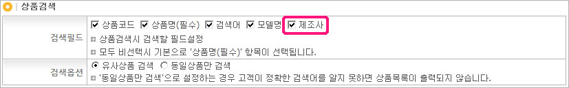 1. °ü¸®ÀÚ ¡· »óÁ¡°ü¸® ¡· ±âŸ¿î¿µÁ¤º¸¼³Á¤ ¡·±âŸ¼³Á¤ ¸Þ´º¿¡ »óǰ°Ë»ö ºÎºÐÀÇ °Ë»öÇʵ忡 "Á¦Á¶»ç"¸¦ üũÇÑ ÈÄ [Àû¿ë]ÇÕ´Ï´Ù.