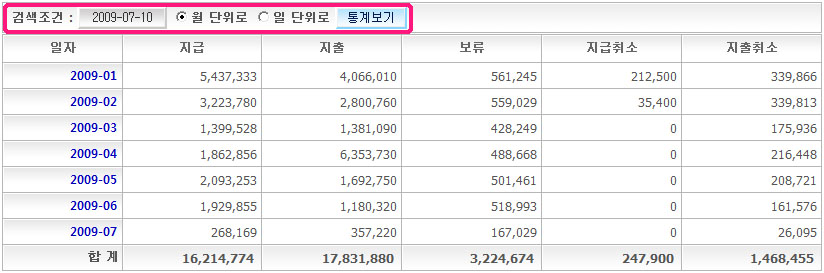 ¾Æ·¡ ±×·¥°ú °°ÀÌ ±â°£º° Àû¸³±Ý/Æ÷ÀÎÆ® Áö±Þ³»¿ªÀ» ¿ù´ÜÀ§·Î º¸°íÀÚÇÏ½Ã¸é °Ë»öÁ¶°ÇÀ» "¿ù ´ÜÀ§·Î" ¼±ÅÃÇÏ¿© Åë°èº¸±â¸¦ ÇϽøéµÇ°í "ÀÏ ´ÜÀ§·Î" ¼±Åýÿ¡´Â °Ë»öÁ¶°ÇºÎºÐ ³¯Â¥¹öư¿¡ ÇØ´ç ¿ùÀ» ¼±ÅÃÇØÁֽŠÈÄ