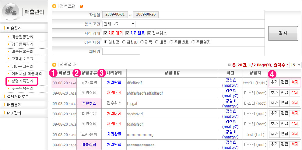 (3) ÁÖ¹®¹øÈ£ : ÁÖ¹®°ú ¿¬°üµÈ »ó´ãÀÇ °æ¿ì ÁÖ¹®¹øÈ£°¡ Ãâ·ÂµÇ¸ç ¹øÈ£¸¦ Ŭ¸¯ÇϽøé ÇØ´ç ÁÖ¹®Á¤º¸·Î À̵¿µË´Ï´Ù.