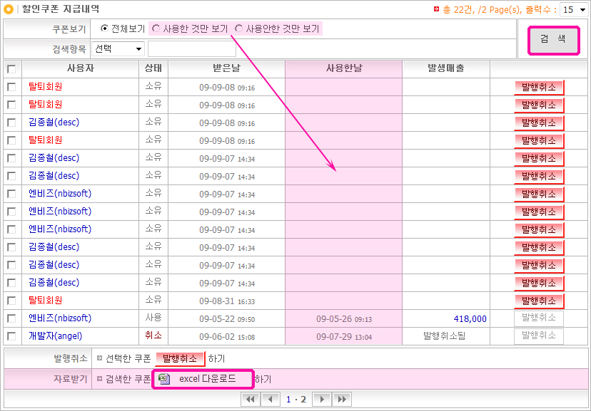 (2)ÀÚ·á¹Þ±â : °Ë»öÇÑ ÇÒÀÎÄíÆù ¹ß±Þȸ¿øÀÇ Á¤º¸¸¦ ¿¢¼¿ÆÄÀÏ·Î ´Ù¿î¹ÞÀ» ¼ö ÀÖ½À´Ï´Ù. (´Ù¿î¹ÞÀº ¿¢¼¿ÆÄÀÏÁ¤º¸¿¡´Â »ç¿ëÀÚ,»óÅÂ,¹ÞÀº³¯,»ç¿ëÇѳ¯,¹ß»ý¸ÅÃâ,À̸ÞÀÏ,ÇÚµåÆù¹øÈ£µîÀÌ ÀÖ½À´Ï´Ù.)