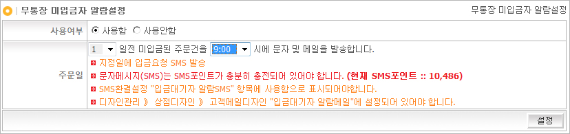 ¹«ÅëÀå ¹ÌÀÔ±ÝÀÚ ¾Ë¶÷¼³Á¤ »ç¿ë¿©ºÎ¸¦ "»ç¿ëÇÔ" À¸·Î ¼±Åà ÈÄ ÁÖ¹®ÀϺκп¡ ¹ÌÀÔ±ÝÀÚ¿¡°Ô Å뺸ÇÒ ÀÏÀÚ¿Í Å뺸½Ã°£À» [¼³Á¤]ÇÕ´Ï´Ù.