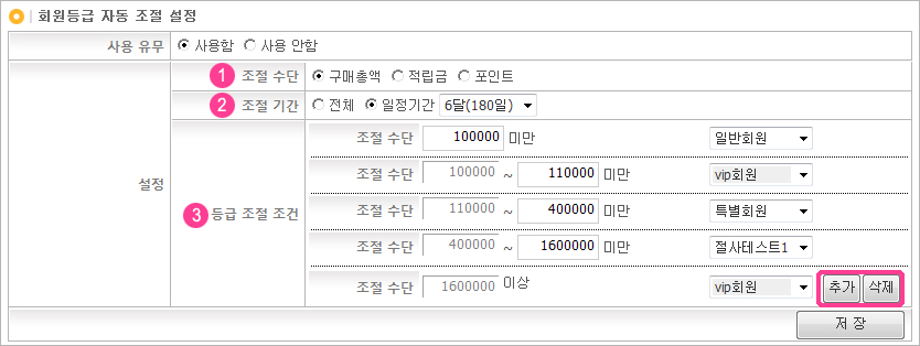 (3)µî±ÞÁ¶ÀýÁ¶°Ç : ȸ¿øµî±ÞÀÌ ÀÚµ¿Á¶ÀýµÇ´Â ±¸°£ ±Ý¾× ¶Ç´Â Á¡¼ö¸¦ ÁöÁ¤ÇÏ¿© Á¶°Ç¿¡ ÀÏÄ¡Çϸé ÁöÁ¤ÇسõÀº µî±ÞÀ¸·Î ÀÚµ¿º¯°æµË´Ï´Ù. µî±ÞÁ¶ÀýÁ¶°ÇÀº [Ãß°¡]¹öưÀ» Ŭ¸¯Çϸé