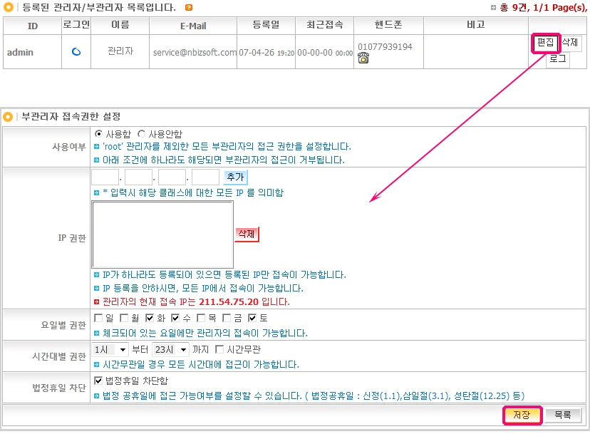 ÇÏ´Ü¿¡ ºÎ°ü¸®ÀÚ Á¢¼Ó±ÇÇÑ ¼³Á¤¿¡¼ ¿øÇÏ´Â Á¶°ÇÀ¸·Î Á¢¼ÓÁ¦ÇÑÀ» ¼³Á¤ÇÑ ÈÄ [ÀúÀå]ÇÕ´Ï´Ù.