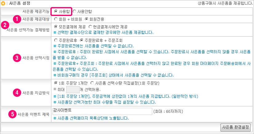 4. »çÀºÇ° Áö±Þ¹æ½Ä : ÇÑ ÁÖ¹®´ç Á¦°øÇÒ ¼ö ÀÖ´Â »çÀºÇ° °¹¼ö¸¦ ¼³Á¤ÇÒ ¼ö ÀÖ½À´Ï´Ù.