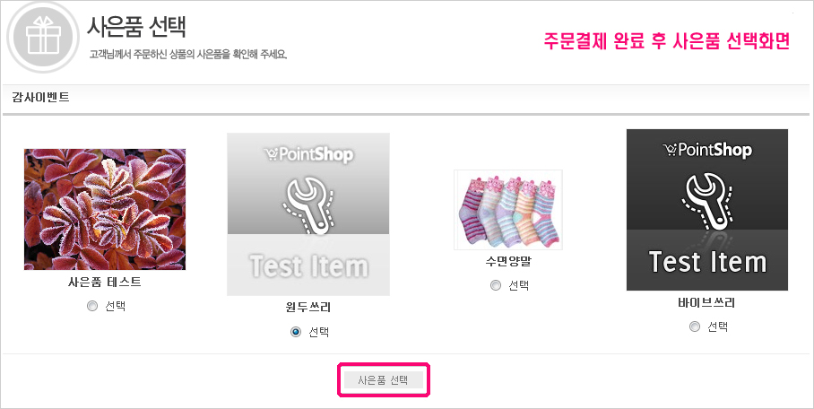 5. »çÀºÇ° À̺¥Æ® Á¦¸ñ : »çÀºÇ° ¼±ÅÃÈ¸é ¸ñ·Ï»ó´Ü¿¡ ŸÀÌÆ²¹Ù¿¡ Á¦¸ñÀÌ Ãâ·ÂµË´Ï´Ù.