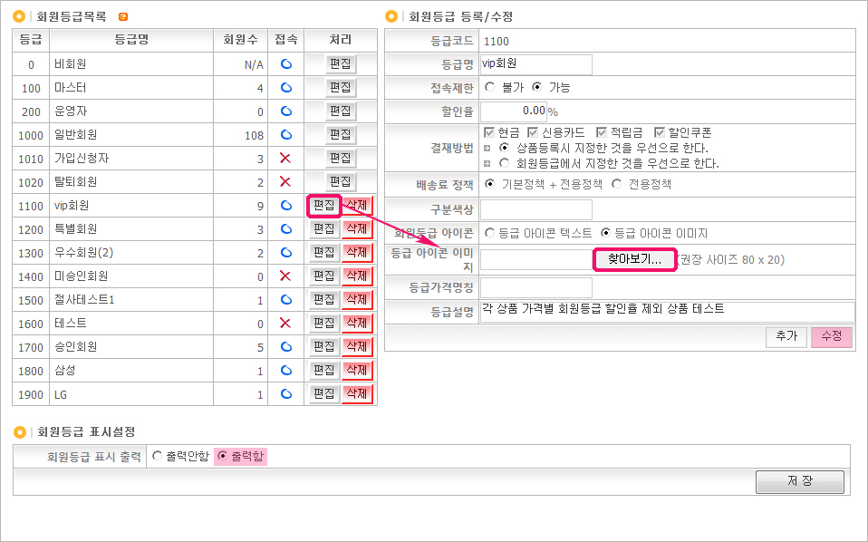 µî±Þ¾ÆÀÌÄÜÀ» Ãâ·ÂÇϱâÀ§Çؼ´Â ¸ÕÀú "ȸ¿øµî±Þ Ç¥½Ã¼³Á¤" ºÎºÐÀ» ¹Ýµå½Ã "Ãâ·ÂÇÔ"À¸·Î ¼±Åà ÈÄ [ÀúÀå]ÇÕ´Ï´Ù.