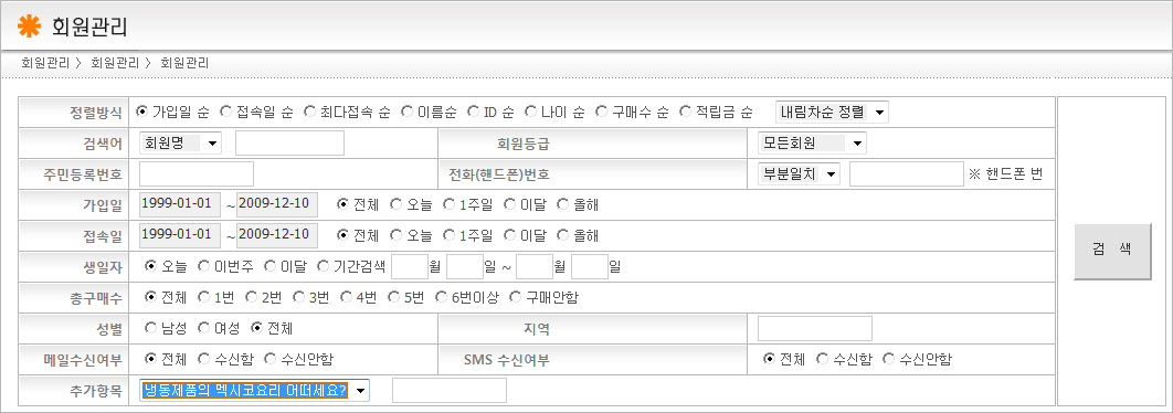 »õ·ÎÃß°¡µÈ Á¶°Ç°Ë»öÇ׸ñ : Á¤·Ä¹æ½Ä->±¸¸Å¼ø (Ãѱ¸¸Å±Ý¾×º°·Î ȸ¿øº° °Ë»öÀÌ °¡´ÉÇÕ´Ï´Ù.) / Áö¿ª -> °¡ÀÔÇÑ È¸¿øÀÇ ÁÖ¼ÒÁö¸¦ ½Ã/µ¿/±¸µîÀ¸·Î ÀÔ·ÂÇÏ¿© °Ë»öÀÌ °¡´ÉÇÕ´Ï´Ù.