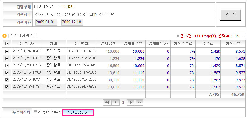 ÆÇ¸Å°Ç¿¡ ´ëÇÑ ÆÇ¸Å¼ö¼ö·á Á¤»ê¿äûÀº ¾Æ·¡ ±×¸²°ú °°ÀÌ Á¤»ê¿äûÇÒ ÁÖ¹®°ÇÀ» üũÇϽðí [Á¤»ê¿äûÇϱâ] ¹öưÀ» Ŭ¸¯ÇϽøé root°ü¸®ÀÚ¿¡°Ô Á¤»ê¿äûÀÌ Á¢¼ö¿Ï·áµË´Ï´Ù.