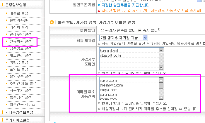 »óÁ¡ ¿î¿µÁ¤º¸¼³Á¤ÀÇ '½Å±Ôȸ¿ø ¼³Á¤' ÇÏ´Ü¿¡ "À̸ÞÀÏ ÁÖ¼Ò ÀÚµ¿¼±ÅÃ" ºÎºÐ¿¡ ¿øÇÏ´Â µµ¸ÞÀÎÀ» µî·ÏÇÕ´Ï´Ù.