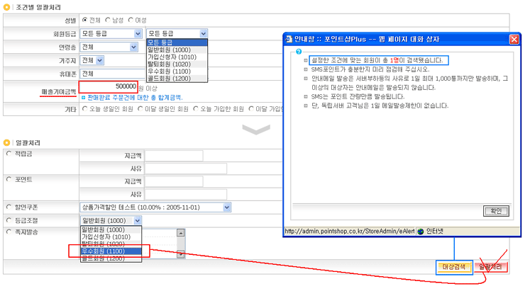 º¯°æÇÏ·Á´Â ȸ¿øÀÌ Æ÷ÇÔµÈ È¸¿ø µî±ÞÀ» ¼±ÅÃÇÑ ÈÄ ¸ÅÃ⠱⿩ ±Ý¾×¿¡ ƯÁ¤±Ý¾× (¿¹ : 500000¿ø ) À» ÀÔ·ÂÇϸé, ¼±ÅÃÇÑ È¸¿ø µî±ÞÀÇ È¸¿øÁß¿¡¼ ÆÇ¸Å¿Ï·áµÈ ÁÖ¹®°ÇÀÌ ÃÑ 50¸¸¿øÀÌ ³Ñ´Â °í°´¸¸ ¼±Åà µË´Ï´Ù.